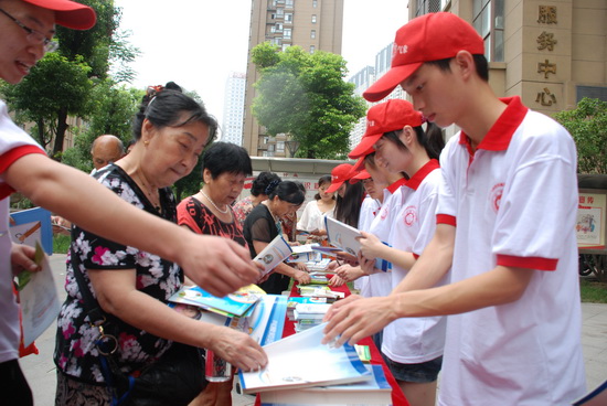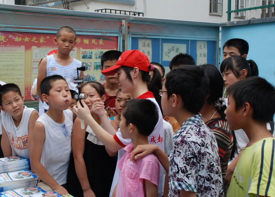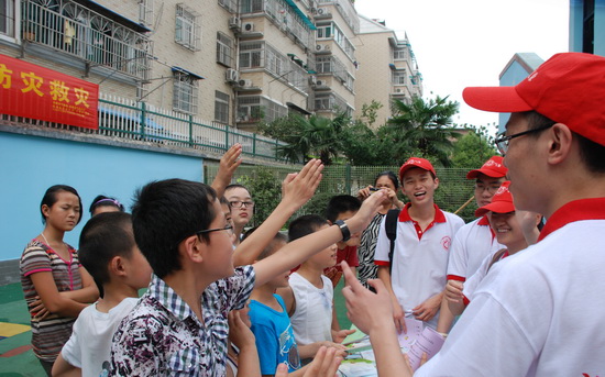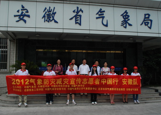 7月12日上午8时, “2012年气象防灾减灾宣传志愿者中国行”安徽队出征仪式在安徽省气象局举行。出席此次出征仪式的有安徽省气象学会秘书长、省气象局相关处室领导及相关工作人员。今年的活动主题是“传播气象文化 科学防灾减灾”。 8名来自于成都信息工程学院的大学生志愿者于7月12日上午来到瑶海区金大塘社区,通过展板、发放宣传资料和科普读物的方式向当地居民宣传了气象防灾减灾的知识,志愿者们也亲自向当地居民们介绍了气象灾害防御措施与形式,提高了他们的气象防灾减灾意识和能力。 下午,一行又来到三里街欢乐流动儿童俱乐部。志愿者们用自己的专业知识向小朋友们介绍了通风干湿表和三杯风向风速表的用途和使用方法,给小朋友们播放了一个与气象知识有关的小短片,并通过游戏、问答等互动形式向小朋友们普及了气象知识。在此期间队员们还接受了来自新华社安徽分社、新安晚报等报社记者的采访。7月13日志愿者们还将奔赴肥西县花岗镇进行宣传。