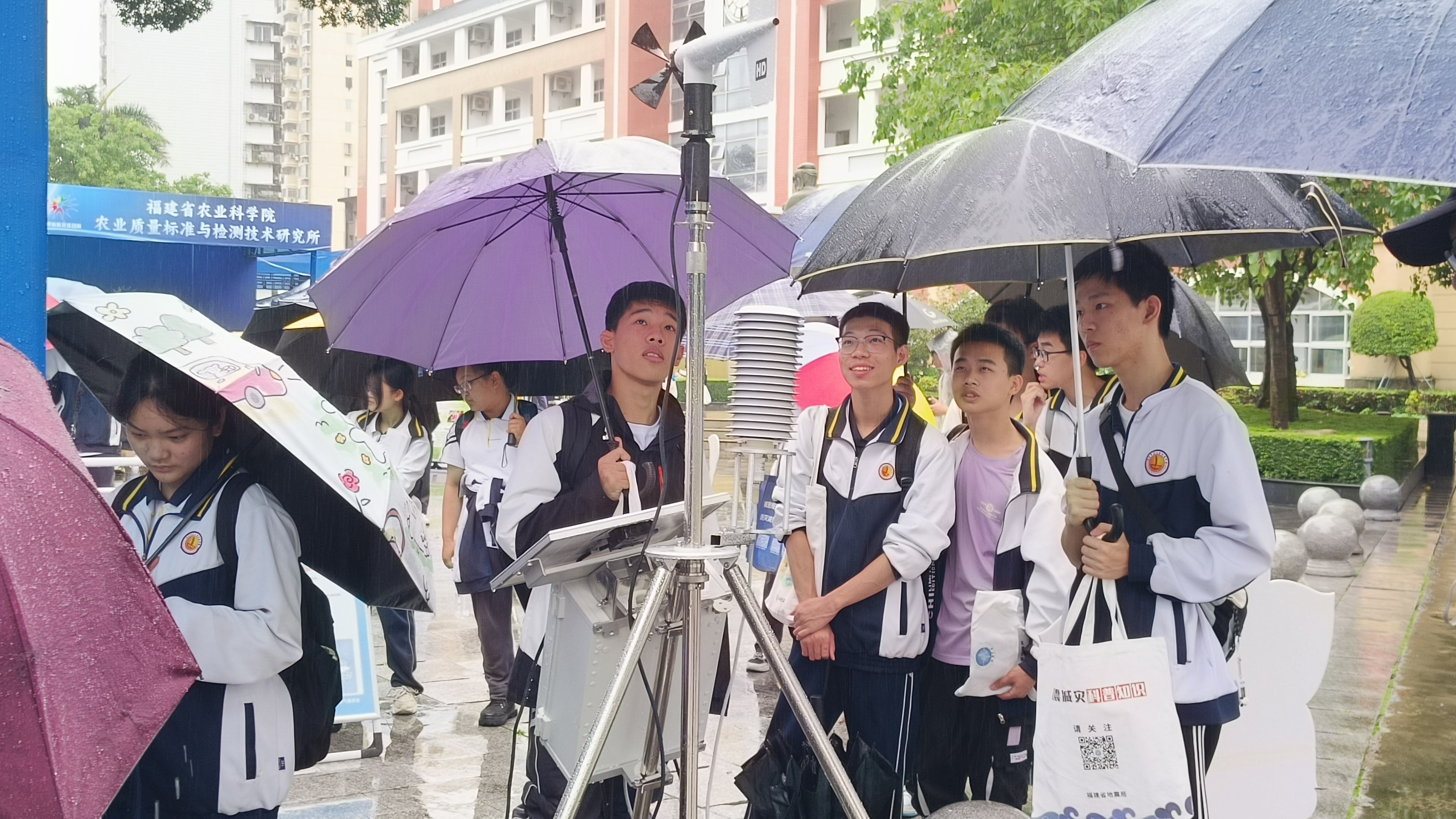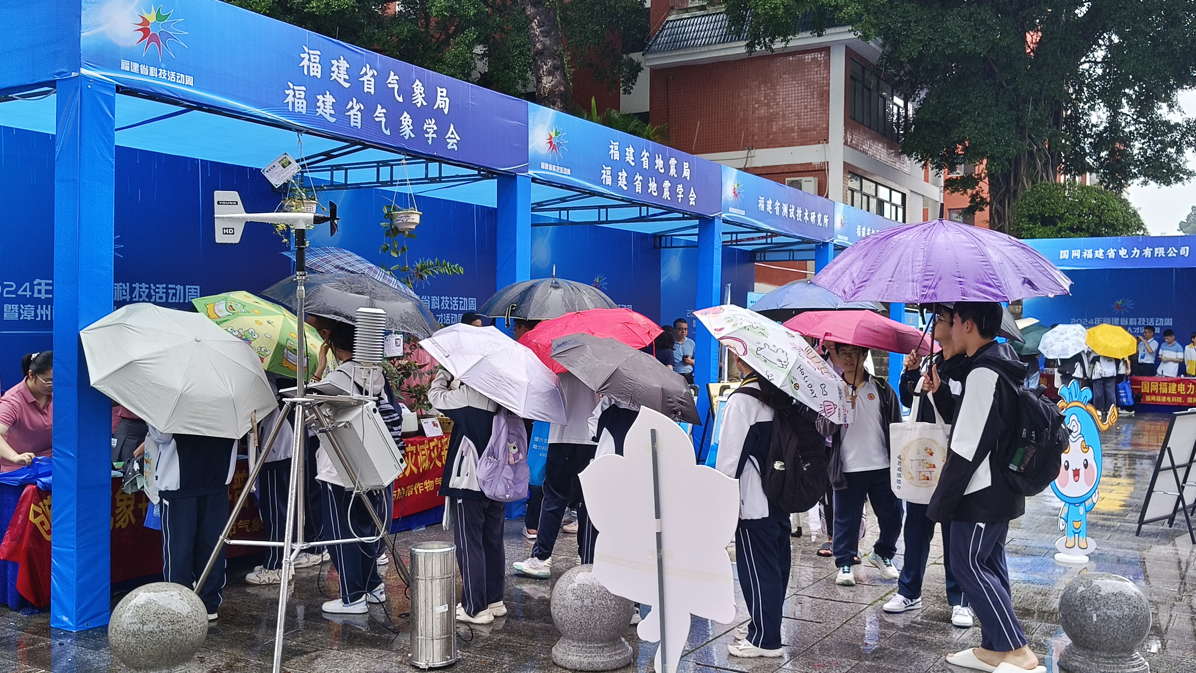 尽管天空下着大雨,但气象科普展位依然人头攒动、气氛热烈。便携式气象自动站、增雨防雹火箭炮弹模型、热带作物盆栽、福建气象IP形象“福天天”和漳州气象IP形象“小仙气”文创品……一件件生动精美的展品吸引了众多师生的目光。气象志愿者们为同学们发放《送给小朋友的15个气象安全知识》《气象防灾减灾避险指南》等科普宣传材料,热情讲解人工影响天气原理、热带作物的生长特点和气候要求等气象科学知识。此外,同学们还可以通过有奖问答环节,赢得人影作业车遥控模型、风云四号卫星模型等精美科普文创奖品。