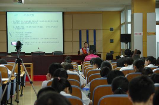在多功能厅,高二文科班的全体同学认真听取了“福建主要气象灾害及其预警与防御”科学报告。省气象台刘锦绣副科长图文并茂地介绍了台风、暴雨、雷电等灾害的基本特征,所提供的各种灾害的时空格局及翔实、准确的气象数据引起了师生们的极大兴趣。特别对于冰雹、高温、雾霾等近年来多发的气象灾害的讲解,更是赢得同学们的密切关注,聚精会神听讲并做笔记。讲座后的互动环节,同学们问题多多,就为什么气象预报会有偏差、哪些手机APP能够及时获得气象预警信息等问题不断提问,对此,刘锦绣用通俗易懂的语言答疑解惑,同学们都露出满意的笑容。