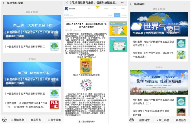 2020年世界气象日期间,福建省气象局、福建省气象学会联合组织全省气象部门开展纪念活动,福建省气象学会秘书处、福建省气象宣传科普教育中心积极落实,发挥气象科普“主力军”作用,在疫情防控特殊时期运用“互联网+科普”思维策划线上活动,坚持开门办活动,部门外与省科协、省科技馆、省水利学会、省图书馆学会、福州科技馆、学校等开展联动合作,部门内加强与中国气象学会、中国气象局宣传与科普中心、地市气象局、气象学会的上下联动,共同加强气象科普品牌展示与推广,丰富“云端”活动 ,提升影响力。