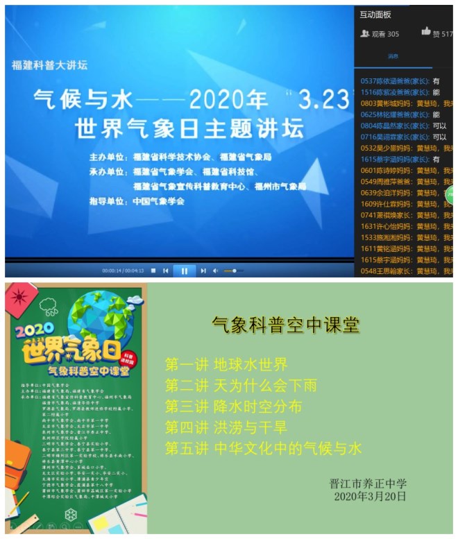 停课不停学,策划气象科普“空中课堂”,联动地市气象学会组织全省28所中小学校、青少年宫参加气象科普“空中课堂”学习,结合学校实际,开展丰富多彩的衍生活动。泉州师范附小学生们收看“福建科普大讲堂”之后,化身“小小气象宣传员”,用童谣、快板、说唱等形式,制作成科普宣传小视频,围绕世界气象日主题用画笔绘制出“自己眼中的气象”,活动亮点还登上省教育厅微信平台;泉州养正中学老师采用钉钉直播的方式,组织同学收看视频并互动问答,同时结合气象日主题开展学生书法作品征集活动;福州乌山小学组织参与空中课堂、绘画气象,线上云游气象等活动,积极协助录制主题宣传视频;漳浦县气象局联动当地青少年宫组织当地七所学校五千多名学生参与空中课堂学习。不含网络传播统计,学校“空中课堂”参与人数达1.4万人。活动亮点亮相中国气象局微信、微博、中国气象学会、省科协微信等平台。此外,组织全省8所学校共9支队伍参加“风云之战”气象知识有奖竞答活动校园巅峰赛,福清华侨中学、龙岩第一中学获得全国高中组第四名、第五名的好成绩。(省气象学会秘书处、省气象宣传科普教育中心科普部)