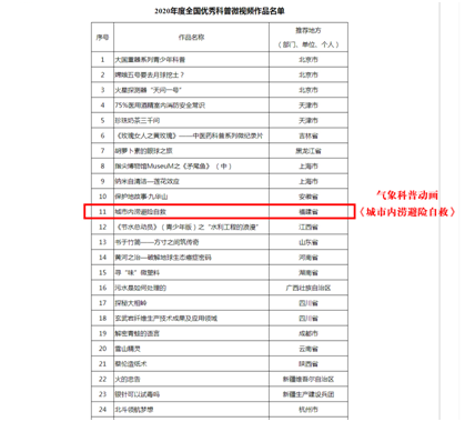 近日,科技部、中国科学院公布2020年度全国优秀科普微视频作品名单,由福建省气象宣传科普教育中心、福建省气象学会创作的气象科普动画微视频《城市内涝避险自救》成功入选,是福建省唯一入选作品。此前,该作品曾荣获2020年福建省优秀科普微视频评选活动一等奖的荣誉。