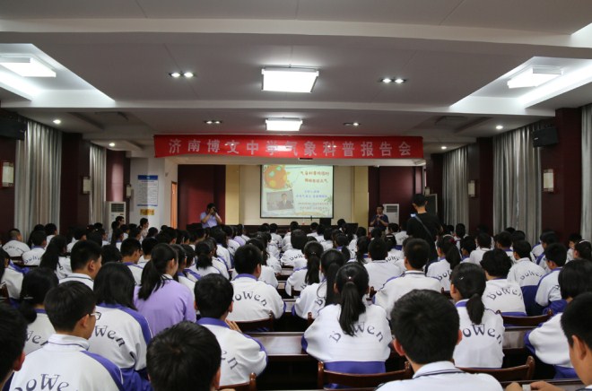 5月19-20日,中央气象台与山东气象学会携手走进山东济南博文中学和山东省实验中学西校,开展了“气象科普校园行----预报员说天气”活动,向学校图书馆赠送气象科普书籍100余册、“气象防灾减灾”和“人与气候”挂图4套,国家气象中心首席预报员、正研级高工孙军为400多名中学生带来了精彩的科普讲座,预报员变身主持人开展了学生提问和有奖抢答,现场气氛热烈。本次活动不仅收到了预期效果,也为山东气象学会的科普工作开拓了思路、提供了可借鉴的经验。