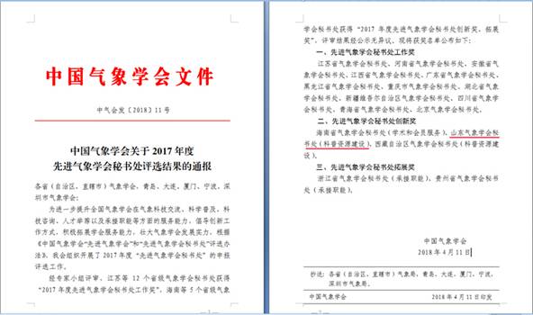 4月11日,中国气象学会发文通报2017年度先进气象学会秘书处评选结果。山东气象学会秘书处获得“先进气象学会秘书处创新奖(科普资源建设)”。