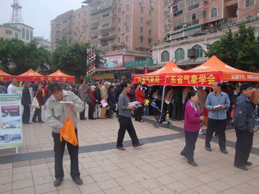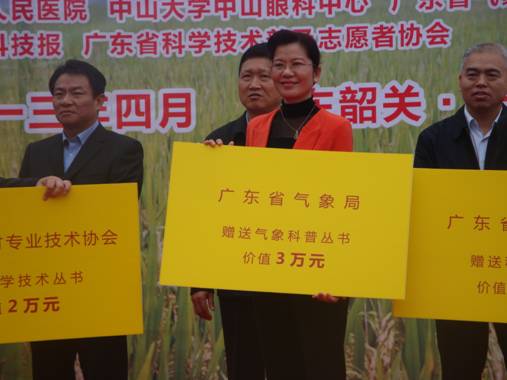 4月2日,由省委宣传部、省科协、省科技厅、省农业厅、省卫生厅、省妇联、团省委、省地震局、省气象局、省农科院和韶关市人民政府等12个单位联合举办的2013年广东省文化科技卫生“三下乡”暨“千会服务千村”行动在韶关乐昌市正式启动。 广东省气象局刘作挺副局长出席了启动仪式并代表省气象局向当地科协赠送了价值3万元的气象防灾减灾科普图书及资料。启动仪式由省科协党组成员、副主席吴焕泉主持,省委宣传部蔡伏青副部长代表主办单位在启动仪式上致辞,现场科普咨询等丰富多彩的活动,吸引了当地8000多名群众参与。 广东省气象学会作为协办单位,组织了韶关市、乐昌市气象局的科技工作者在启动仪式现场,向数千名群众免费发放了《气象灾害防灾避险指南》、《中小学气象灾害防御指南》、《天气预报的奥秘》、《防雷减灾36计》、《四季天气与保健养生》、《如何应对气象灾害》等气象防灾减灾科普小册子一万余册,并提供了气象灾害到来时如何进行防灾避险、气象对于农业生产有什么影响、如何针对四季天气开展保健养生等现场咨询服务,获得了群众的一致好评。大批群众均早早来到现场,将专家们团团围住,就所关心的问题进行咨询,同时将派发的气象科普资料一“抢”而空。通过本次活动,必将进一步普及气象防灾减灾知识,提升我省城镇及农村地区的防灾减灾意识与能力。