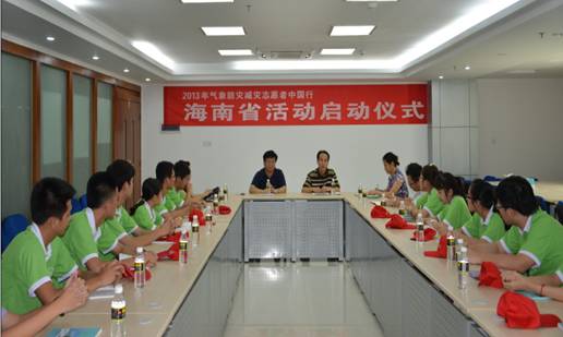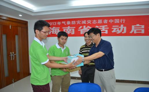 海南省气象局副局长辛吉武在启动仪式上讲话  海南省科学技术协会学会部部长吴钟海在启动仪式上讲话  海南省气象局副局长辛吉武向志愿者赠送科普材料