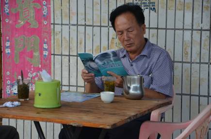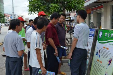 7月25日, 海南省乐东县利国镇,老百姓驻足观看并热情讨论防雷知识  7月25日,海南省乐东县利国镇市民聚精会神地阅读防灾减灾知识读本 7月25日, 志愿者同省气象学会、乐东县气象局的工作人员合影