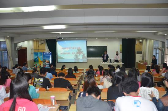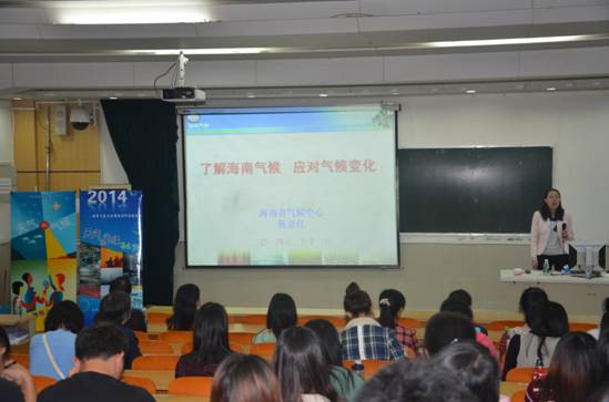 3月11日下午,中国气象学会和海南省气象学会联合主办的“2014世界气象日系列报告会”在海南师范大学地理与旅游学院开讲,海南省气候中心张京红研究员做了题为“了解海南气候,应对气候变化”的报告。 此次报告会结合2014年“3•23” 世界气象日纪念主题“天气和气候:青年人的参与”,向公众普及了气候及气候变化的相关知识,宣传了气象行业在应对气候变化、防灾减灾中开展服务的情况等。张京红研究员向广大师生详细介绍了海南省气候概况、气候变化的事实、过去一年的气候概况及十大天气气候事件,同时号召青年学生们关注气候变化,从身边小事做起,为应对气候变化、实现绿色崛起做出积极努力。 台下听众对报告内容颇感兴趣,提问不断,并填写了调查问卷。报告会现场还发放了数百份应对气候变化宣传册等相关宣传材料。