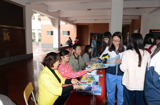 学生们在科普咨询台领取科普材料