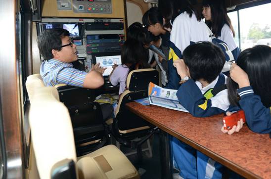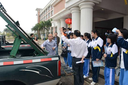 工作人员和师生们交流人影知识  学生们饶有兴趣地研究气象应急车