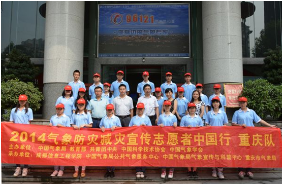 2014年7月8日上午,由中国气象局、教育部、共青团中央、中国科学技术协会、中国气象学会共同主办,成都信息工程学院、中国气象学会秘书处、中国气象局公共气象服务中心牵头承办的2014气象防灾减灾宣传志愿者中国行重庆分队出征仪式在重庆市气象局举行。