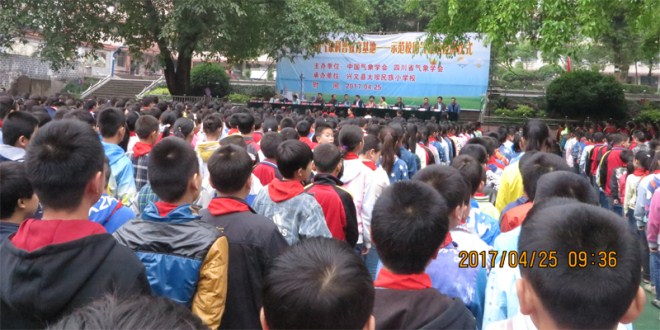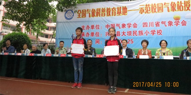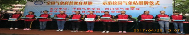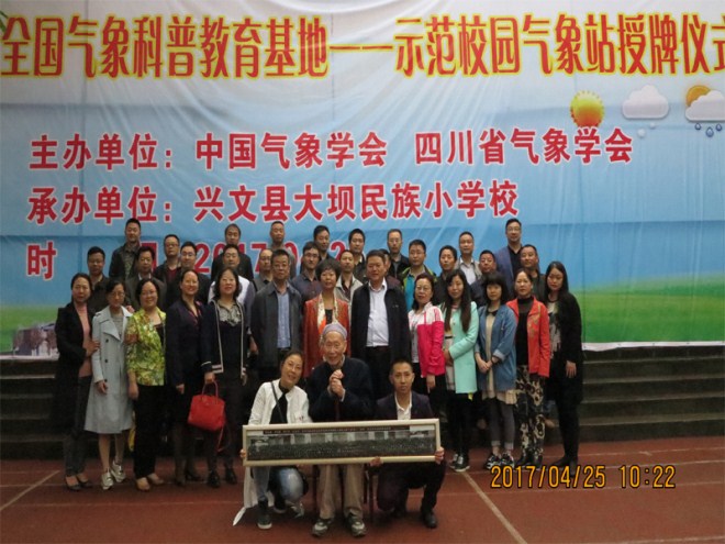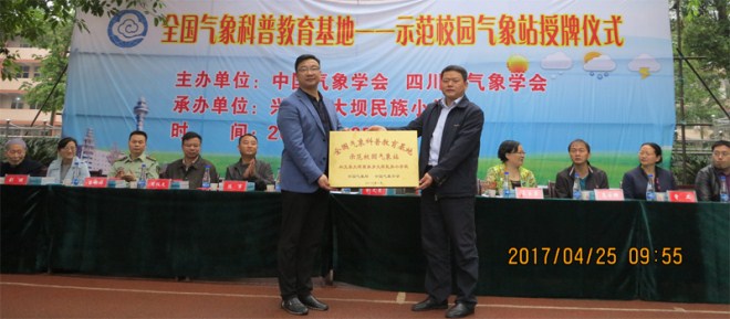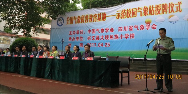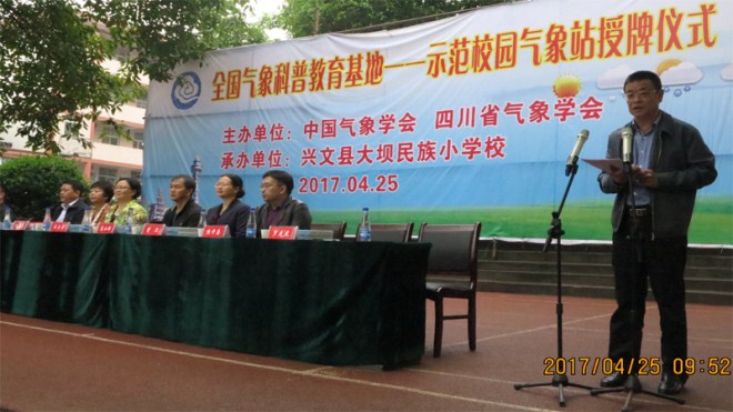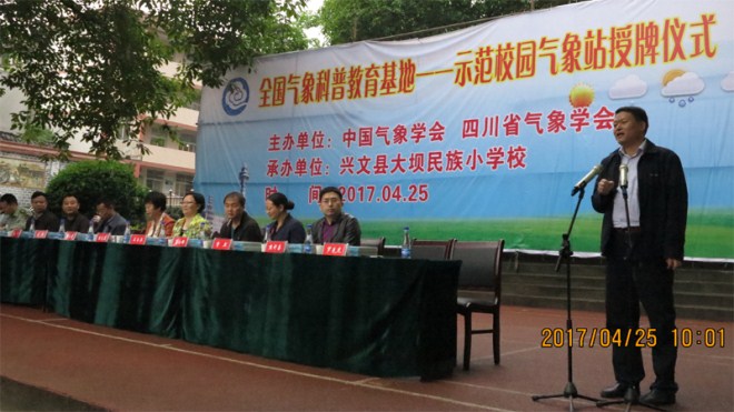 4月25日,“全国气象科普教育基地—示范校园气象站”授牌仪式在兴文县大坝苗族小学校举行。中国气象学会秘书处综合部部长刘文泉,四川省气象学会秘书长吴刚,宜宾市气象局党组书记、局长周仪文,四川省科协学会部陈军、宜宾市科协副主席陈克兰、兴文县委常委、武装部政委王世伟等相关部门领导出席授牌仪式。