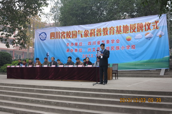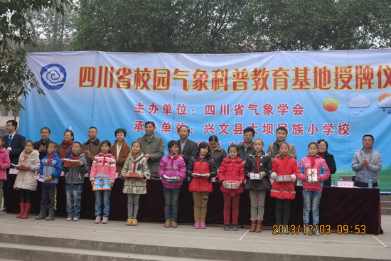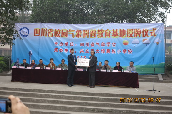 12月3日,四川省第一批校园气象科普教育基地授牌仪式在宜宾市兴文县大坝苗族乡大坝民族小学校隆重举行。省气象局总工程师、气象学会副理事长钟晓平,省科协学会部调研员李晋等省、市气象、科协相关负责人出席授牌仪式。兴文县政府副县长肖萍出席仪式并讲话。 授牌仪式上,省气象学会副理事长钟晓平宣读了四川省气象学会关于《命名第一批校园气象科普教育基地的决定》,并向大坝民族小学郑重授牌。省科协学会部调研员李晋对该校丰富多彩的校园气象科普教育给予高度肯定,认为该校坚持开办近半个世纪的“红领巾气象哨”堪称中国校园气象科普教育的“活化石”。肖萍在讲话中向关心、支持兴文县气象科普工作的各级领导表示感谢,对大坝民族小学科普教育基地的成立表示祝贺,对基地下一步的工作提出希望。省气象学会和兴文县气象局还为该校赠送了科普图书和音像制品。 仪式结束后,钟晓平一行兴致勃勃地参观了校园。校长刘建为大家详细介绍了建校历史、“红领巾气象哨”发展历史,以及校园文化建设情况。大家为该校浓厚的科普气氛和深厚的科普文化深深吸引。 兴文县大坝苗族乡大坝民族小学校始建于1906年,1964年创办了四川省唯一一个由学校自行承办的“红领巾气象哨”。近半个世纪以来,“红领巾气象哨”坚持每天三次的观测记载,积累了60多万字的气象、水文资料,先后为大坝地区发布气象预报1600余份,为宜宾、重庆、昆明、纳溪、叙永等地拍报水文雨情电报4000多次,为防汛抗旱提供决策依据;该哨水文资料每年都会收入国家水利部《中国水文年鉴》,为综合治理长江中上游,葛洲坝和长江三峡工程建设提供水文数据;该哨气象信息还及时传递到当地政府、农村村组、人工增雨防雹网点,为工农业生产和防灾减灾起到重要作用。1972年,“红领巾气象哨”被列为兴文县气象科普教育基地;1978年,该哨派代表参加全国气象会议,受到邓小平、华国锋、叶剑英等国家领导人接见;1983年,四川团省委、省科委授予该校“红旗单位”称号;2013年,又成为四川省首批“校园气象科普教育基地”。