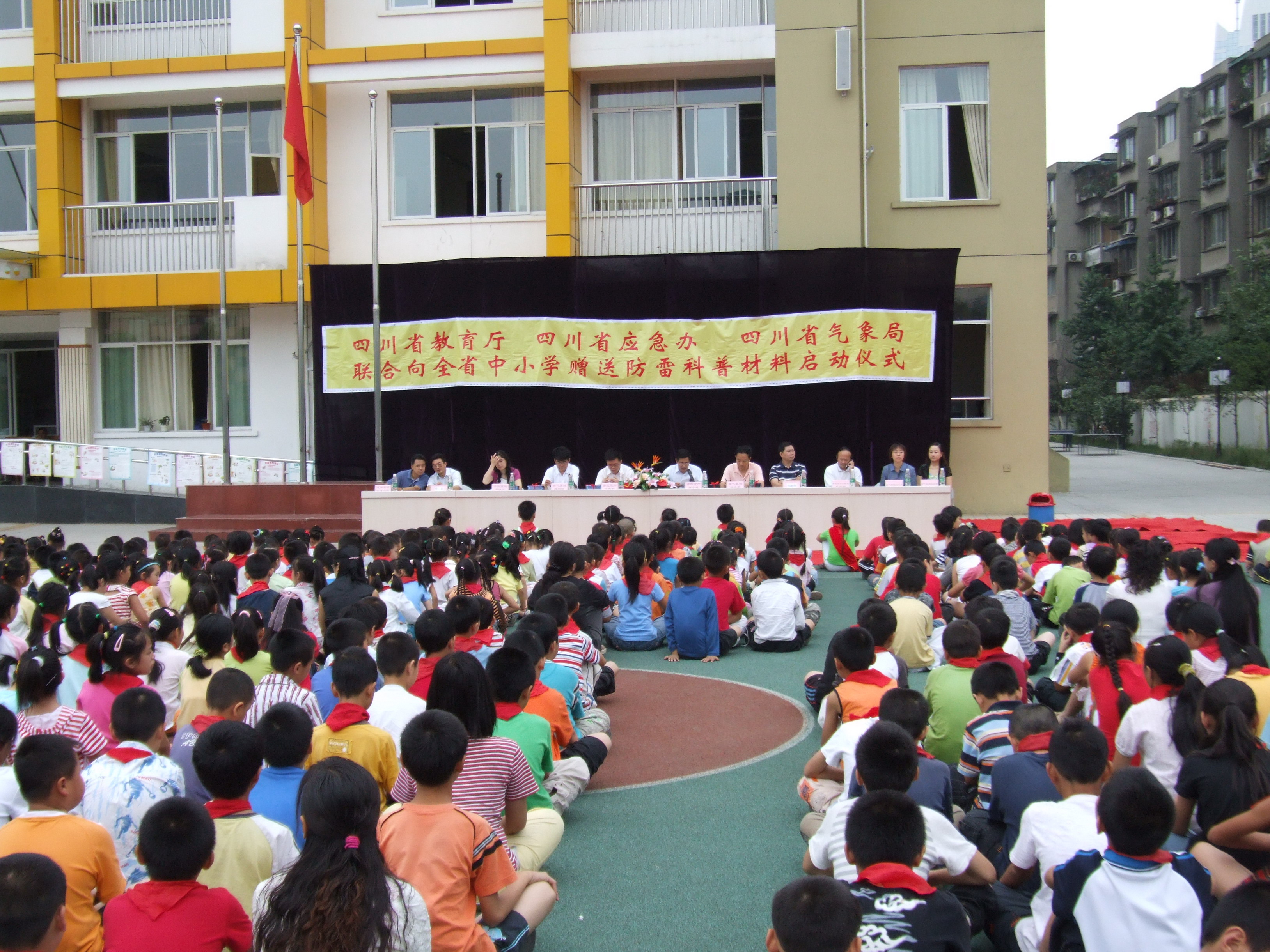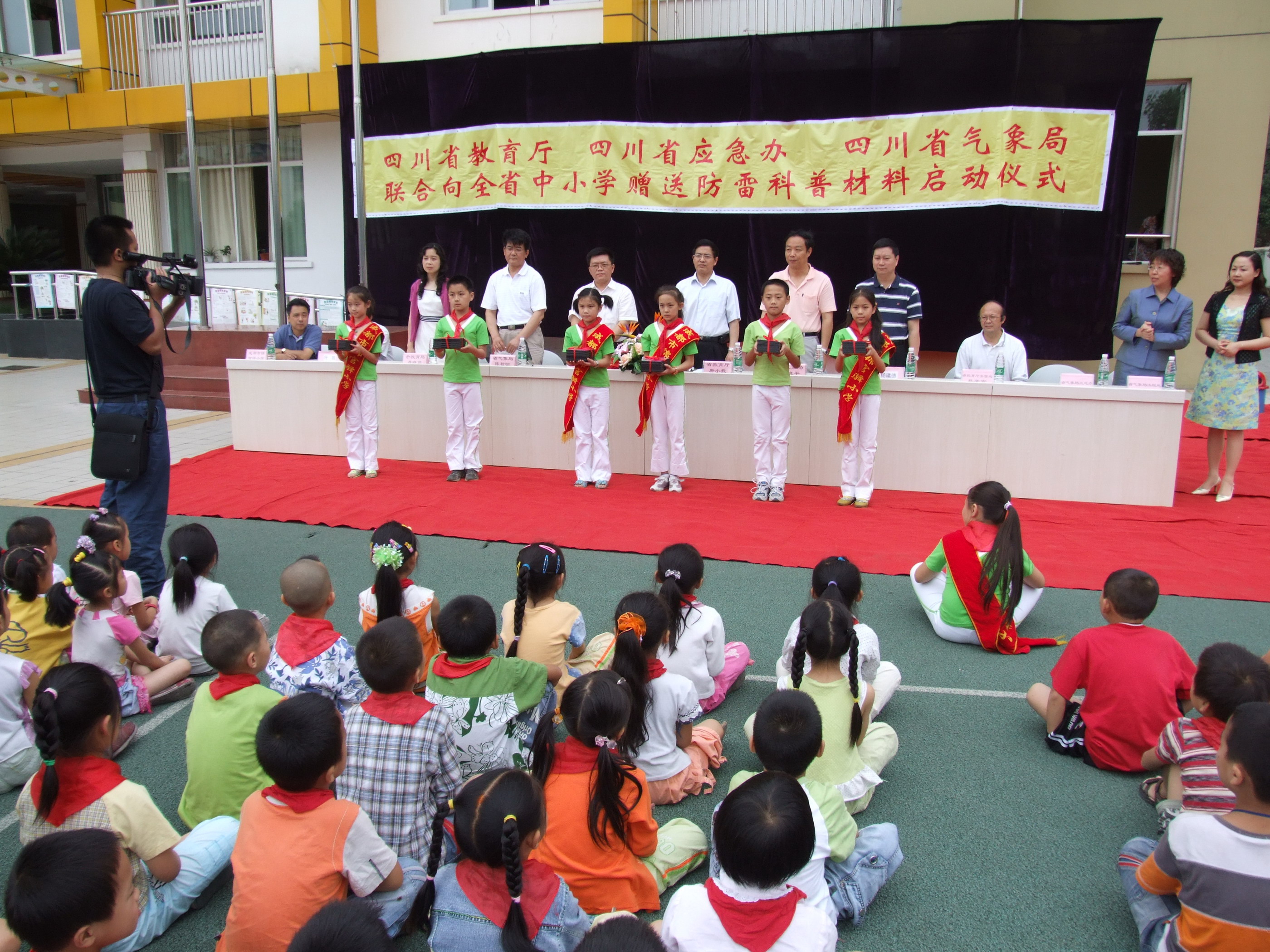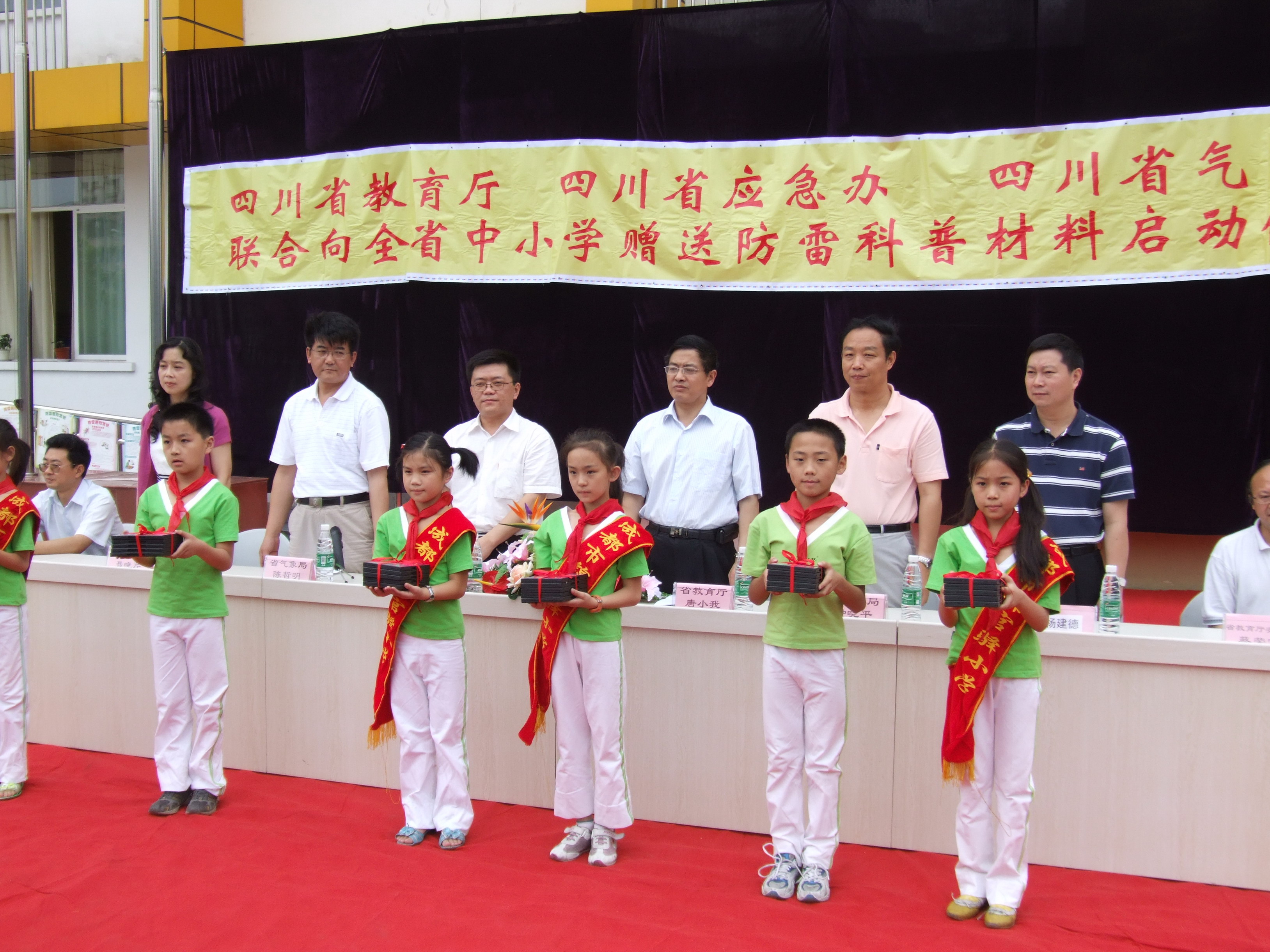 6月20日,四川省教育厅、省应急办、省气象局、四川省气象学会联合向全省中小学赠送防雷科普材料启动仪式在成都市锦官驿小学举行,此举表明四川“防雷科普进校园”活动步入实质性阶段。 今年重庆开县某学校“5、23”重大雷击事故引起国务院和气象、教育等部门的高度重视,中国气象局、教育部、国务院应急办联合开展了向全国中小学校免费赠送防雷科普材料活动。省气象局也及时与省教育厅、省应急办加强联系和沟通,适时启动赠书仪式。在启动仪式上,省气象局副局长、四川省气象学会副理事长钟晓平发表了简短而热情洋溢的讲话,他指出:四川是雷电灾害高发地区,加强雷电灾害防御对促进经济社会发展,保障学校乃至全社会安全具有十分重要的意义。三部门联合开展的“防雷科普进校园”活动旨在让广大师生了解更多的防雷科普知识,进一步增强防雷安全意识,提高雷电防护能力。学校防雷安全工作任务艰巨,希望广大学校以此次活动为契机,切实推动学校防雷宣传和防雷安全教育工作,确保校园平安、学生平安、教师平安。 省教育厅副厅长唐小我、省应急办副主任任春阳作了即席讲话,成都市教育局机关党委书记聂晓芹,锦江区副区长杨建德,省教育厅安管处处长蔡荣富和省气象局应急办、气象学会、法规处等参加了启动仪式,启动仪式由四川省气象局纪检组长陈哲明主持。 钟晓平、唐小我、任春阳、陈哲明等向中小学生代表赠送了防雷科普DVD光盘和科普挂图,全省所有中小学都将陆续得到赠送的防雷宣传资料。 新华社四川分社、人民日报四川记者站、四川日报、华西都市报、成都商报、四川电视台等媒体进行了现场采访报道。