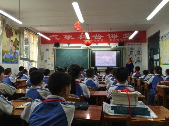 为开展好科技周气象科普宣传活动,按照贵州省气象局统一部署,贵州省气象学会联合多部门积极组织了多项气象科普进校园活动。2015年5月22日上午,贵州省气象学会组织专家来到了由九三学社贵州省委推荐的科技帮扶学校贵阳市宅吉小学,为该校4年级的学生上了一堂生动有趣的《观云识天气》气象科普课,主讲人贵州省气候中心高级工程师陈静同志通过前期的精心准备,用丰富的图片、生动的语言、深入浅出的讲解,将气象科学知识寓于活泼的课堂气氛中,1个多小时的课上下来,学生们意犹未尽,兴趣盎然,互动积极,达到了预期的科普宣传效果。贵州省气象学会同时还向该校赠送了气象科普书籍和制作气象科普模型的手工材料。图为课堂现场(谢海瑛 曾甜)