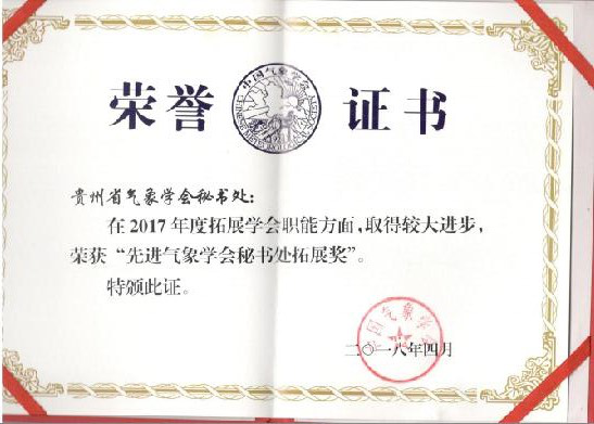 4月11日,中国气象学会公布了2017年度“先进气象学会秘书处”的评选结果,贵卅省气象学会秘书处获“先进气象学会秘书处拓展奖”。