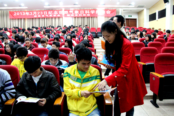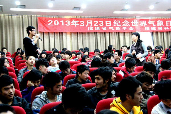 2013年3月23日下午,福建省气象学会与福建省科技馆共同举办了“2013年3月23日纪念世界气象日科学报告会”,特别邀请了省气候中心高级工程师邹燕博士做题为《今年气象灾害热点事件及福建灾害气候演变趋势》的科普报告。来自福建师范大学、福建农林大学、福州大学、福建交通职业技术学院、闽江学院和福建工程学院6所福州高校的300多名学生参加报告会。