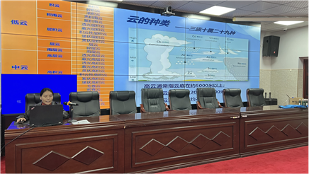 认识彩虹”,讲解了天气预报制作、发布过程以及云的基本形态及其对应天气,介绍了彩虹的形成原因和类型。对照讲解内容与同学们进行互动交流,引起了学生们的极大兴趣,提高了他们对天气预报和云的认识。