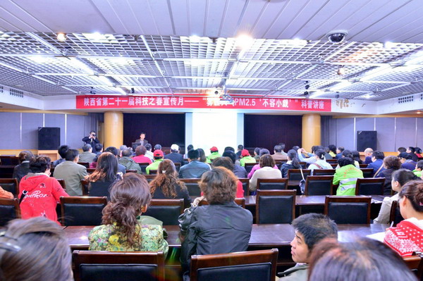 2013年4月3日上午陕西省科技馆2楼报告厅坐满了来自西安新城区的各界代表,一场雾霾天气PM2.5“不容小觑”的科普报告会正在举行,来自陕西省气象局的肖舜博士,从气候变化与气溶胶、我国及关中PM2.5污染现状几个方面,用大量的图片,浅显易懂的语言,向公众讲述着近期人们耳熟能详话题“PM2.5” 。肖博士告诉大家什么是PM2.5,什么是PM10, 我国及关中PM2.5污染现状,更是统计了西安市大气PM2.5 浓度与居民总死亡率变化关系、与居民心脑血管疾病死亡率变化关系以及与居民呼吸道疾病死亡率变化关系的五年统计结果,报告揭开“PM2.5”、PM10的面纱,使人们更加自觉的了解,关注气象环境就是关注自身健康。