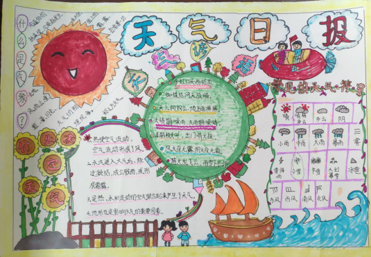 南街小学5年级彭婉婷同学作品《天气日报》,她说:“天气、太阳与地球有着密切的关系,气象的变化影响着地球和我们人类的生活环境,与我们息息相关,所以我们要多了解气象知识,方便我们的生活。”