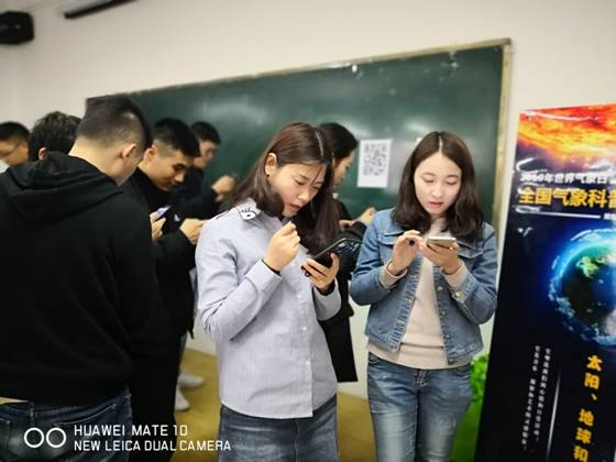 气象专家现场组织学生进行2019年世界气象日气象知识线上线下有奖竞答活动,并准备了丰富的小奖品;同学们积极踊跃地参加竞答活动。