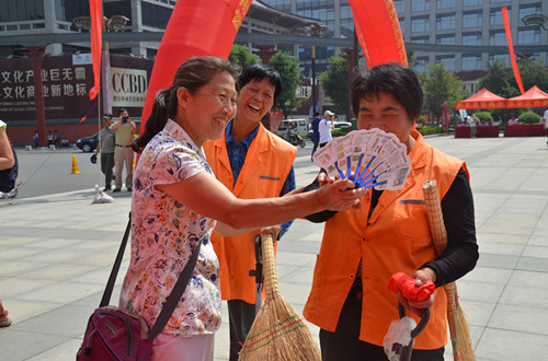 图为防雷专家为环卫工人赠送雷科普小扇子,为她们送去一丝清凉。