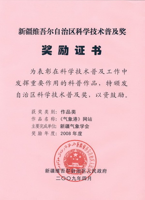 2009年4月21日, 第四届新疆青年科技奖、首届自治区科普奖颁奖在乌鲁木齐昆仑宾馆举行,中央政治局委员、自治区党委书记王乐泉,自治区党委副书记、自治区主席努尔•白克力,中国科协党组成员、书记处书记冯长根等领导为获奖者颁发奖牌和证书,由新疆气象学会主办的气象港网站获得首届新疆维吾尔自治区科学技术普及奖(作品类),受到表彰和奖励。一个学术团体创办的网站经历了5年辛勤耕耘,终于生根发芽,成为天山脚下的奇葩。是对网站工作者的最大欣慰。 创办《气象港》网站,是利用网络对于交流信息和推动科学的发展起着越来越大的作用、引领科技人员的要求、借助Internet搭建的服务平台进入世界互联网之林。网站办得如此出色,除了领导重视以外,得益于长期在新疆工作、热爱气象事业、乐于奉献的离退休专家张学文等。2005年一群年轻的老人,退休后不愿闲着,依然利用所学知识,从事气象公益事业,不拘泥办公场所,家里有电脑、上网游览,汲取信息,翻译并编写、处理稿件文章、图片等。气象港自创办以来,以报道新疆内外、国内外气象新闻、科技文章、科普知识为主线,还有理念、问题、专题、词典、图书、科技人物、气象文化、图片、法规等20多栏目形成了一个以气象为核心的知识集合,每天有很多更新内容,吸引着科技人员在这里充电、加油,使浏览量逐步提高。在这些成绩的背后,是一批不计较是否有报酬,以干事业为乐趣,热衷知识的传播,追求充实的人生,让社会来认可自己,也正是这种理念,一些内地的专家也来当义务编辑。 梅花香自苦寒来。2007年北京大学蒋尚城由教授:“由于友人的推荐,我浏览了新疆气象学会的网站《气象港》,一个地方民间学术团体的网站竟办得如此出色,使我十分惊喜。它的栏目丰富多样,不仅具有浓郁的地方特色,又与中国甚至全球的气象、气候环境紧密联系。应该说这是天山脚下的一个奇芭,值得推荐给大家”。南京信息工程学院丁裕国教授认为:“它充满了求实、创新精神,其健康向上、丰富多彩的版面使人耳目一新,而其生动活泼的文风与品味高雅的格调更是其它网站所不及的”。2006年新疆都市报以“一群年轻的老人”为题:“在当今无数的各类网站中,这可能是编辑人员年龄最大的一个网站”。2008年自治区科协对学会进行考核,作为会工作的特色工作予以肯定。中国气象报、中国气象学会都对此进行了报道和表扬。 我们愿气象港这朵天山脚下的一个奇葩,历经风雨,花香四溢。