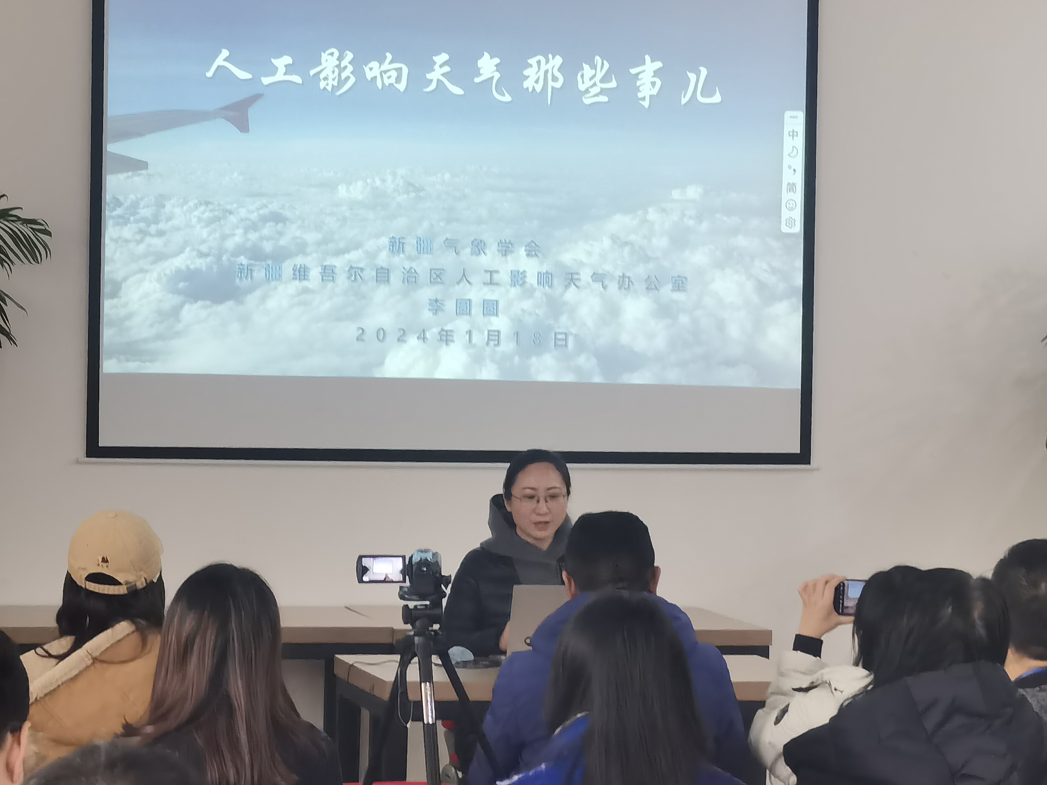自治区人影办副主任、高级工程师李圆圆向气象局各直属单位职工、社区居民讲解人工影响天气的原理,包括人工增雪、人工防雹的相关知识,并与到场的各族居民积极互动,用通俗易懂的语言和生动的例子向大家科普气象知识,增强居民防灾减灾意识,保障人民生产生活安全。