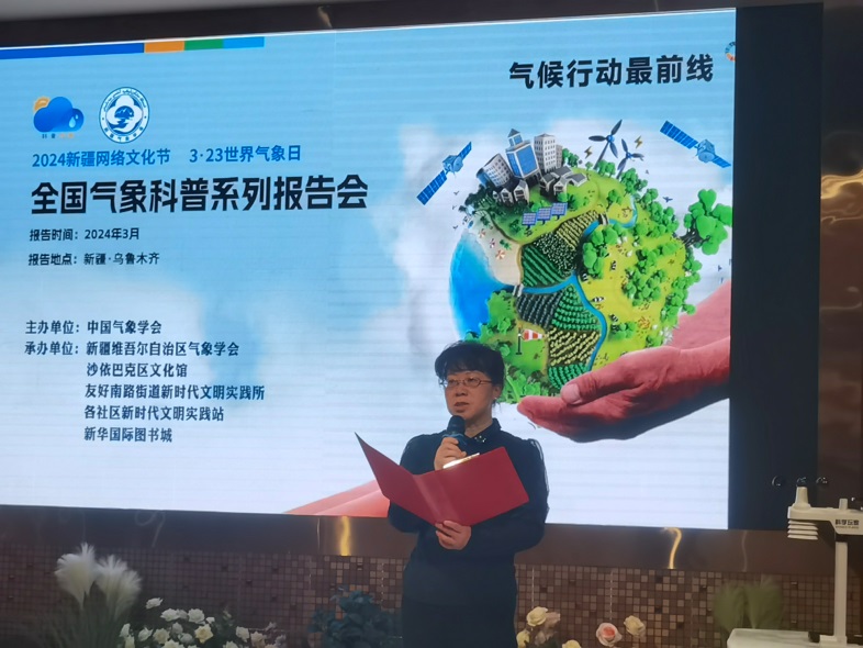 新疆气象学会正高级工程师王凤梅简述了世界气象日的由来及此次活动的目的、意义。为社区居民播放了世界气象日科普宣传片,呼吁全社会行动起来,在减缓和适应气候变化领域进行更加有效的合作,积极应对全球变暖给人类生存和发展带来的严峻挑战。