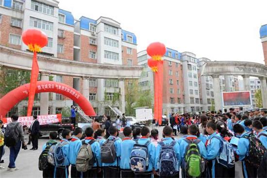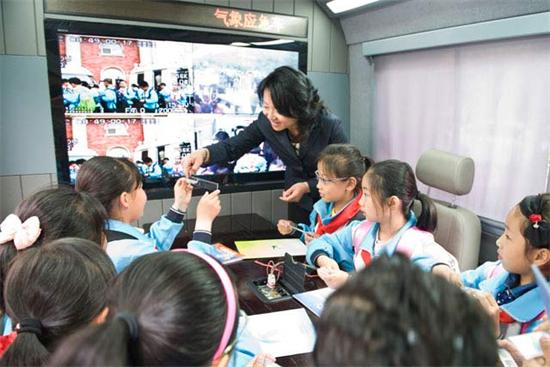 5.12防灾减灾日百信三期小区“气象防灾减灾进社区”学生在气象转播车内观看