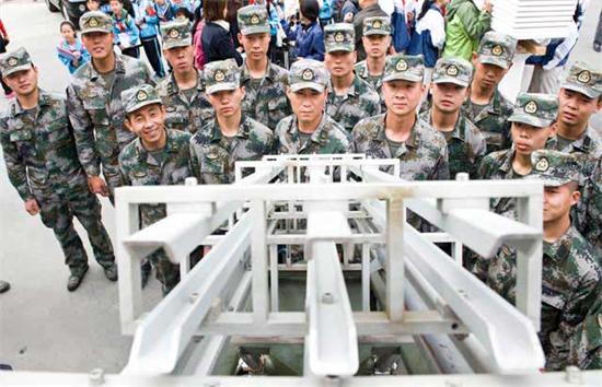 部队官兵观看人影火箭发射架