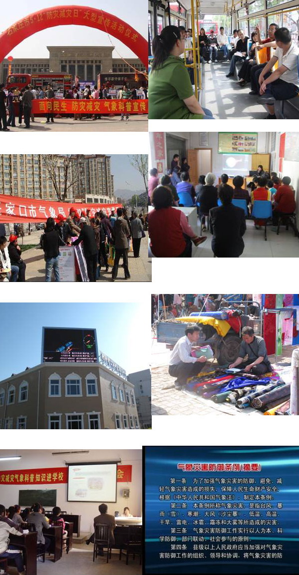 承德市局采取多种形式开展防灾减灾宣传活动。一是提前谋划编发专刊。5月7日在发行量5万多份的《承德电视报》--人与自然栏目编发多篇防灾减灾科普文章。二是深入社区。5月8日该局科技人员深入近郊冯营子镇大集开展宣传,布置展板,发放科普材料,呼吁全社会提高防灾减灾意识和能力,最大限度减轻和避免灾害造成的损失,加强防灾减灾,从每个人做起,从“低碳”做起,受到当地群众的欢迎。三是通过媒体进行宣传。通过手机气象短信、电视天气预报节目、广播等媒体进行防灾减灾宣传。四是参加集中宣传。5月12日防灾减灾日当天,在市区广场参加由民政局牵头组织的防灾减灾法律法规知识宣传活动。