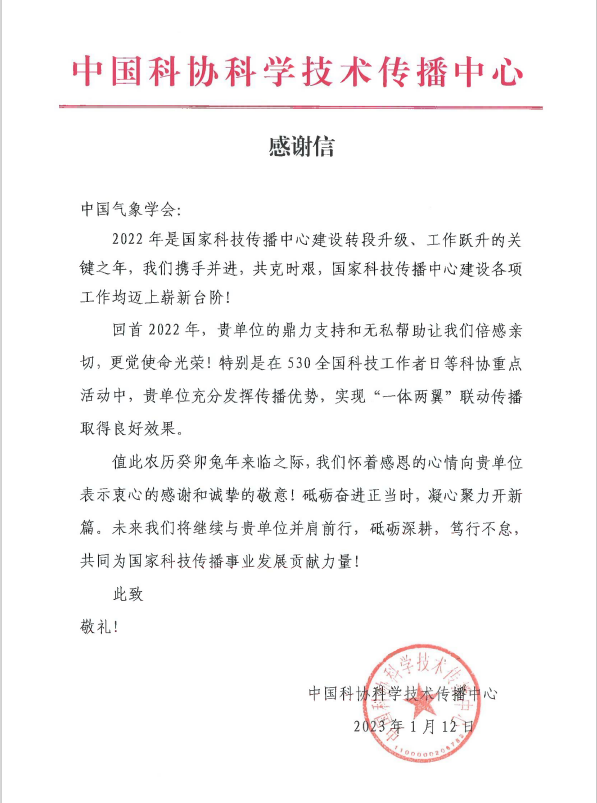 2022年,在中国科协各项重点活动中,中国气象学会充分发挥传播优势,实现“一体两翼”联动传播取得良好效果,多次受到中国科协表扬。今后,中国气象学会将继续砥砺深耕,笃行不怠,努力为国家科技传播事业发展贡献更大力量。