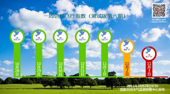 为了降低信鸽因异常空间天气丢失的风险,给信鸽赛训活动提供安全的地磁保障。目前,国家空间天气监测预警中心已经推出“信鸽飞行指数7天报”服务,以微信的形式定期推送,免费为广大信鸽爱好者提供未来7天的地磁环境预报,作为信鸽赛训日期制定的参考。有了这个“7天报”,信鸽活动就可以提前一周进行安排,更不会出现比赛当日因地磁暴原因临时取消比赛的情况了。