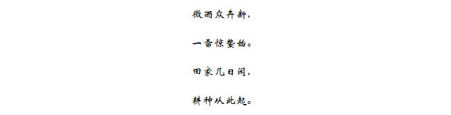 各家各户开始忙了,平常可以闲聊,但是一到惊蛰,就没工夫了,所以“过了惊蛰节,亲家有话田间说”。“过罢惊蛰节,耕地不能歇。”老话说:“锄头三寸泽。”意思是锄头上有三寸雨。所谓靠天吃饭,并非完全靠天吃饭。耕田本身,就在减少对于气候的过度依赖,将收成掌握在自己的锄头上。正如贾思勰在《齐民要术》中强调:“耕田第一,收种第二,种谷第三。”可见,惊蛰时节陆续开始的春耕在一年之计中的重要作用。