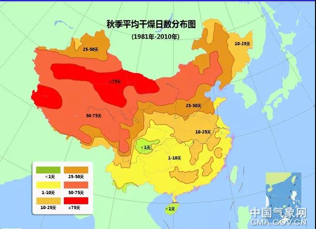 总体来看,秋季我国北干南湿的分布十分明显。其中最干燥的地区要数图中大红色的区域——北方西部地区和青藏高原,秋季干燥日数达75天以上。而我国长江以南大部分地区处于图中的黄色区域,秋季比较湿润,干燥日数小于10天。四川东南部、云南南部以及海南等地秋季干燥日数小于1,也就是说,这些地方日最小相对湿度≤30%的情况,平均而言连一天都不到。