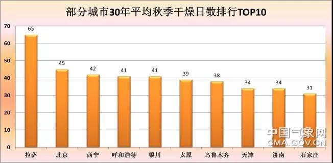 具体到大城市来说,全国秋季最干燥的省会城市是拉萨,平均有65天,其次是北京、西宁、呼和浩特、银川等几个北方的都会城市。其中第二干的居然是北京,这一点小编在数据分析出来前没有想到的,看来北京的朋友9~11月份要多注意防燥方面的身体调养。而全国秋季最湿润的省会城市前三甲当数海口、重庆、成都了,多年平均秋季干燥日数分别为0天、1天、1天。