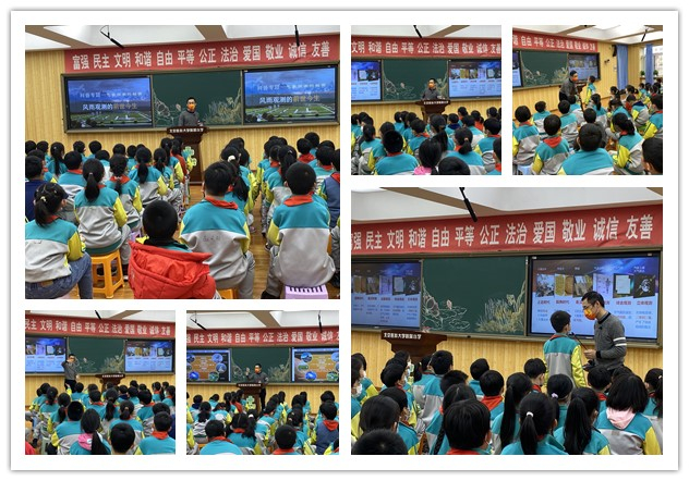 “告诉您关于气象探测的秘密”——北京医科大学附属小学:中国气象局气象探测中心高级工程师刘达新从大气探测的前世讲到今生,从地面讲到立体空间观测,层层展开,一个个互动问题引导同学们不断思考、深入探索问题的答案,每一个问题,刘老师都亲自走到同学们身边进行交流。更有趣的是他还在讲座过程中通过现场实验证明了大气压强的存在。全校1800多名同学聆听了讲座。